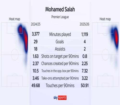 从数据来看,萨拉赫本赛季状态明显下滑,场均射门从1.63次下降到0.8次,场均创造机会、对手禁区内触球、突破次数分别从2.37次、10.5次、3.36次下降到2.25次、7.32次以及3.22次。