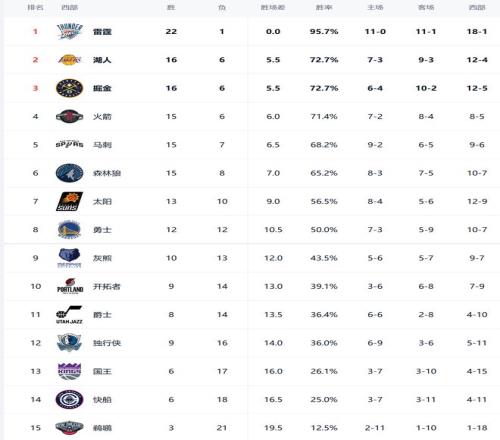 今日比赛后湖人、掘金、火箭排名互换,国王、快船排名互换,其他西部球队排名不变。