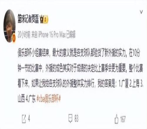 由于新赛季的单节时间缩短为了10分钟,再加上四节七人次的外援政策,不少媒体和球迷都认为,外援才是决定一支球队成绩上限的主要因素。就在日前,北京记者贾磊对新赛季各队的外援实力进行了排名,他认为通过俱乐部杯赛的表现来看,外援实力最强的四支球队分别是广厦男篮、上海男篮、山西男篮和广东男篮。